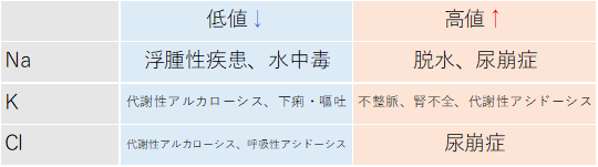 ・K (3.5~5.0mEq/L) … 神経の伝達、筋肉・心臓の収縮